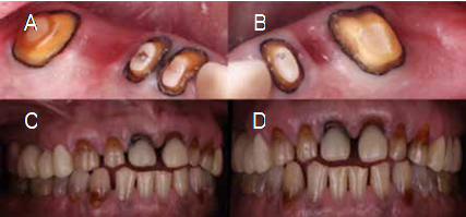 Periodontal phase was performed in the maxilla, which consisted of the extraction of tooth #16 due to an endodontic perforation, and of teeth #25 and #27 due to root caries; tooth #14 was treated endodontically and a fiberglass post was placed for the degree of destruction. Teeth #15, #17 and #26 were treated endodontically by hypersensitivity, and provisional fixed acrylic restorations were placed in the posterior-superior sector for the post-extraction ovoid pontic formation in the zone of teeth #16 and #25 (Figure 1D). Periodontal phase was performed in the lower arch, as well as the removal of amalgam restorations with microfiltration in the occlusal margins of teeth #37, #46, and #47; in addition, extractions of third molars #38, and #48 were indicated (Figure 1E).