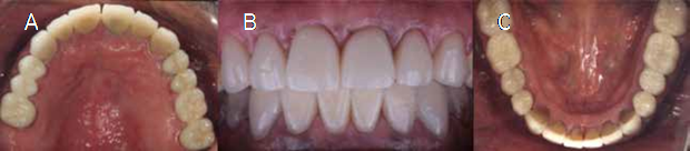 First, the crowns are tested and dental floss is placed in the interproximal areas of the stumps, in that this will facilitate the elimination of cement residues. Glass ionomer cement (Ketac Cem, 3M) was employed following the manufacturer’s specifications, and the crowns are placed on the stumps pressing the occlusal surface. Then a roll of cotton is inserted so that the patient is able to aid us in pressing down until the material has finished its hardening time. The surplus cement and interproximal dental threads are removed. Finally, the occlusion is newly reviewed, providing incisive and canine guides for a mutually protected occlusion. Finally, oral hygiene instructions are indicated to the patient (Figures 5A, 5B, and 5C).