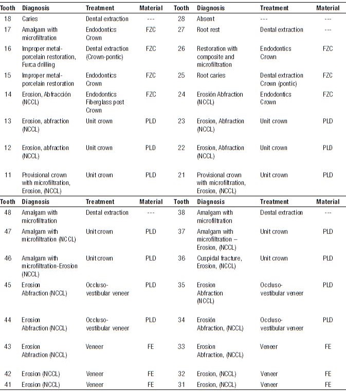 The treatment plan is based on reducing the factors that led to the formation of NCCL. The treatment goals in this case were to restore the damaged tooth structure and reestablish the function and aesthetics, returning the functional anatomy of each tooth, reconstructing the occlusion with the increase of the vertical dimension lost, restoring the esthetic appearance of the teeth, and reducing the hypersensitivity. Prosthetic rehabilitation was planned and divided by arcades and quadrants. Table 1 depicts the treatment plan for each tooth. With information from the study and waxing models of diagnosis, an increase in the vertical occlusal dimension was made, which is based on the esthetic demand and the functionality of the restoration materials.