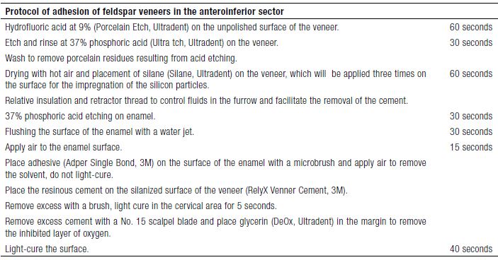 The restorations of the veneers were tested on the teeth to make any necessary interproximal adjustment, for which the use can be made of pastes such as Variolink Veneer Try in (Ivoclar, Vivadent) or some agent with glycerin (DeOx, Ultradent), to simulate the post-cementing results. The adhesion protocol is described in Table 3.