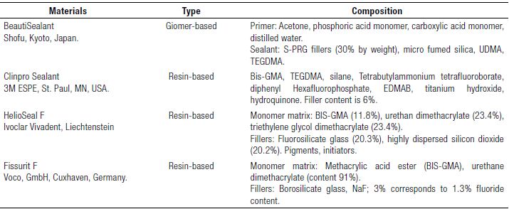 Three resin-based, and one giomer-based fissure sealant materials were evaluated in this study. Sealants were used in accordance with the manufacturers’ instructions. The compositions and manufacturers of the employed materials are given in Table 1. Fissure sealants were divided into 4 groups: BeautiSealant (Shofu, Japan), Clinpro Sealant (3M ESPE, USA), Helioseal F (Ivoclar Vivadent, Liechtenstein), Fissurit F (Voco, Germany).