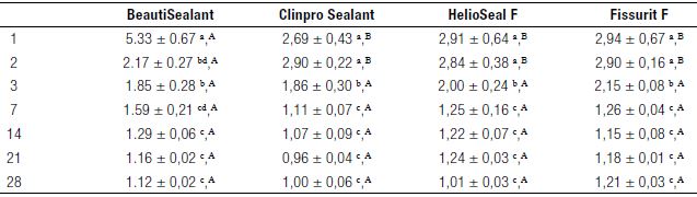 Various media such as acidic media (24), artificial saliva (25) and deionized water can be preferred to determine fluoride release of restorative materials. Since no ion is present in deionized water, it is thought that fluoride release can be estimated more precisely. This idea is accepted by many researchers (17,18). Therefore, deionized water was preferred to be compatible with other studies in our study protocol. On the other hand, the fluoride ion release stops when equilibrium is achieved due to the concentration gradient mechanism (26). Therefore, as suggested by other researchers, medium was changed at 24- hour intervals (27,28,29). The fluoride ion release is a complicated mechanism affected by intrinsic and extrinsic factors, such as material solubility, composition, powder-liquid ratio, surface área of the specimen, and the environment (30,31). The amount of fluoride release, which prevents demineralization and promotes remineralization is not known exactly. In some studies, this amount is reported to be between 0.02 and 0.06 ppm (32). However, it is preferable to use materials with the high and prolonged fluoride ion release, since the fluoride ion presence in oral cavity reduces the enamel solubility (13,14). According to the results of our study, resin-based sealant materials produced a fluoride release of approximately 2.5 to 3 ppm on the first day, which was approximately half of the giomer-based sealant. The amounts of fluoride release decreased with time and remained at about 1-1.5 ppm after the 7th day and remained unchanged until the end of 4th week.