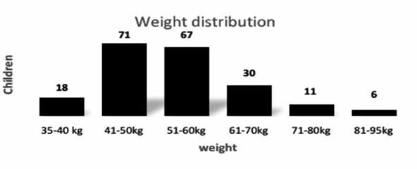 Regarding body weight (see Figure 1), the results showed that the majority of the population studied had a weight of between 41 and 50 kg, and average weight was 53.61 kg. (SD, ±11.09 kg).