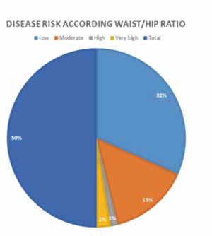 Considering the WHO criteria for the waist/ hip index, patients were classified according to the risk of cardiovascular and metabolic diseases as follows: low risk, 55 (50 boys and five girls); moderate risk, 60 (23 boys and 37 girls); high risk, 81 (79 girls and two boys), and very high risk, seven (four boys and three girls). The percentage distribution is depicted in Figure 2.