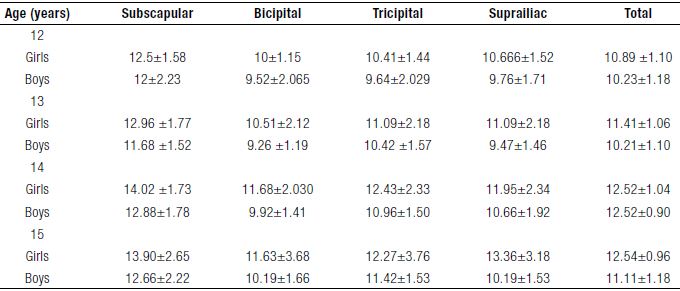 With respect to the average of the skin folds, we may observe in Table 1 that the largest fold is the subscapular fold in girls aged 14 years and the smallest is the bicipital fold in boys 13 years. It was also revealed that female gender is greater in terms of the average values of the folds compared to male gender.