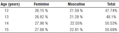 The percentage of body fat increases with age (Table 2): at the age of 14 years, it was observed that female gender had a higher percentage of body fat compared with that of the male gender.