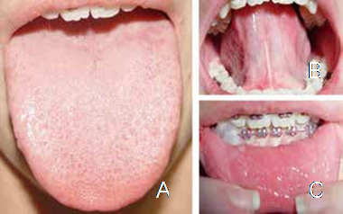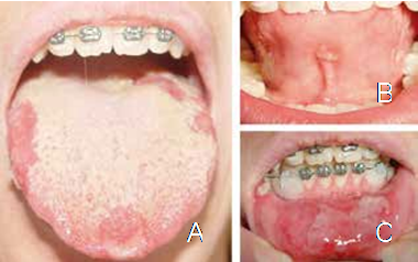 Al realizar el examen clínico, se observó dorso de lengua con placa central saburral y en bordes laterales úlceras superficiales muy dolorosas, de forma variada con halo eritematoso y cubiertas con una seudomembrana blanquecinogrisácea; también en el frenillo lingual y en toda la mucosa labial superior e inferior presentaba ulceras similares que se unían y formaban lesiones más grandes (Figura 1); en encía y paladar duro no presentaba lesiones. Las lesiones aparecieron inicialmente hace mes y medio en forma espontánea y sin lesión inicial que recuerde, el médico de empresa las trató por herpes y luego por cándida sin ninguna mejoría; por más que utiliza cera sobre los brakets y utilizar Admuc® (ungüento de Camomila) directo en las úlceras no se alivió. No se palparon adenopatías, ni se observaron alteraciones de contorno facial ni en piel. La paciente refirió no haber tenido fiebre.