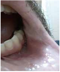 Al realizar el examen clínico, se observó en bordes laterales y ventral de lengua múltiples ulceraciones de forma variada; en mucosa yugal izquierda una úlcera única irregular, con halo eritematoso y cubierta con una seudomembrana blanquecinogrisácea; el paciente refiere que eran varias úlceras que se unieron y formó una sola más grande, (Figura 5), hace una semana sintió un ardor y la zona era como una “mancha roja” después ya estaban las úlceras, muy dolorosas y limitaban la apertura bucal, lo que ha utilizado son enjuagues con Vantal® bucofaríngeo (clorhidrato de bencidamina) y ya no le duelen pero no desaparecen y le arden al comer, sobre todo piña y cosas ácidas. No se palparon adenopatías, ni se observaron alteraciones de contorno facial ni en piel.