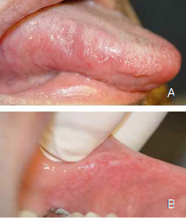 Al realizar el examen clínico, se observó dorso de lengua saburral, en ventral, mucosa labial y yugal múltiples úlceras de variada forma con halo eritematoso y cubiertas con una seudomembrana blanquecinogrisácea; en sectores se unían y formaban úlceras más grandes, sumamente dolorosas que limitaban la apertura de la boca (Figura 3), no recuerda la lesión inicial sólo que al inicio le ardía la zona y luego ya estaban las úlceras; el médico las trató por herpes sin ninguna mejoría. Refiere que en el último año ha tenido unos tres episodios de úlceras, pero resolvieron con ácido hialurónico en gel. A nivel de cuello presentaba adenopatía en el nivel I izquierdo de 1 cm, tipo ovoide y dolorosa a la palpación, tiempo de evolución dos días. No se observaron alteraciones de contorno facial ni en piel.