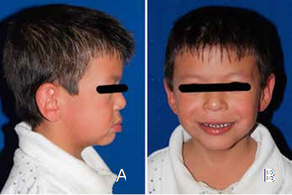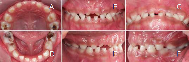 It was unusually found that primary mandibular central incisors had early exfoliated and permanent central incisors and first molars were already erupting. Those teeth have presented enamel diffuse opacities, possibly associated with molar-incisor hypomineralization (9), so the patient underwent frequent follow-ups and fluoride varnish applications. The future monitoring plan is to assess craniofacial growth and development, management of the developing occlusion and continue with the preventive strategies. It is evident that the patient will require orthodontic intervention (4), which will be started when the patient was considered to be emotionally prepared to cooperate with oral appliances. At age seven, we expect the first permanent molars and permanent incisors to be fully or partially erupted, so we could start maxillary orthopedics to intercept class III malocclusion.