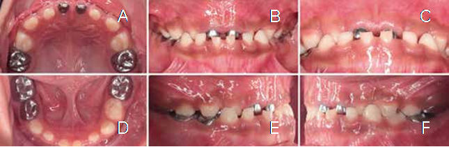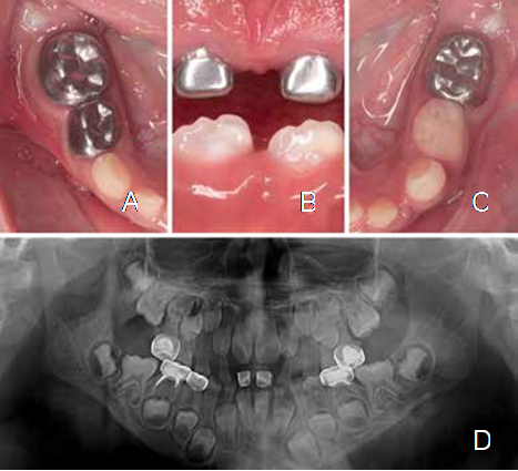 Considering that delayed dental eruption is associated with CH, it was prioritary to perform pulp therapies in primary teeth and to restore the masticatory function (2) along with preventive measures. It was decided to restore primary maxillary central incisors with stainless steel crowns due to enamel hypoplasia. At first it was considered to place reversed crowns to correct the anterior crossbite (14), nevertheless, the excessive overjet didn’t allow it. For operatory procedures, local anesthesia was achieved with one cartridge of lidocaine with epinephrine, previously corroborated that the patient didn’t have any heart disease and limiting anesthetic dose according to patients weight (4).
