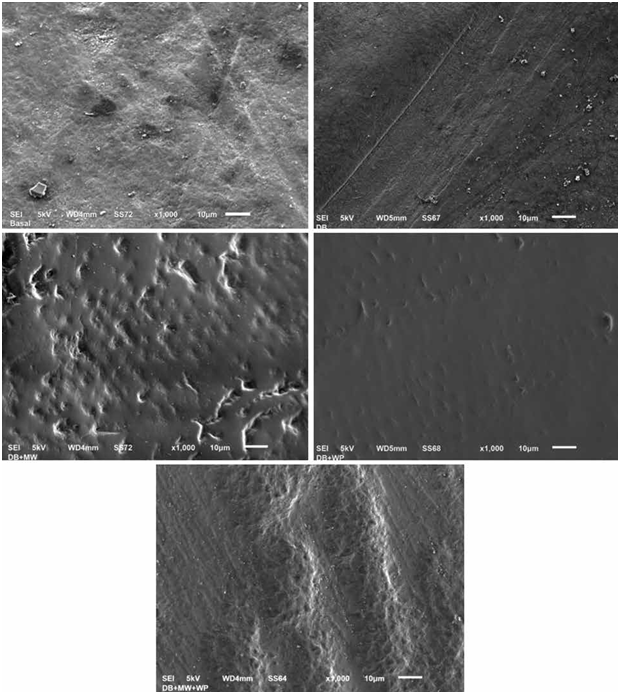 Figure 1 shows us representative images of the SEM of the micromorphology of the enamel surface before the treatment (baseline state) and 10 days after being treated according to the study group specifications. It can be observed that the morphology of the surface of the enamel previous to the different treatments is typical to the prismatic enamel, that is to say, with an irregular geology with elevation, craters and fractures (Fig.1a). The surface of the enamel after the 10 days of brushing with whitening toothpaste shows great similarities to the baseline state, with lines present along the surface probably caused by the mechanical function of the toothbrush (Fig.1b). The surface of the enamel of the group where, besides brushing with toothpaste, mouth wash was added daily for 10 days shows morphological characteristics of a prismatic enamel (presence of prisms of the enamel) with pores and irregular elevations (Fig.1c). The enamel’s surface of the group where, besides brushing with toothpaste, a whitening pen was used, shows characteristics of prismatic enamel with evidence of an etching pattern type I (nucleus of the prism) in some areas of the sample (Fig.1d). The enamel’s surface of the group where, besides brushing with toothpaste, mouth wash and whitening pen were used, also show characteristics of prismatic enamel, with high reliefs, presence of transversal and longitudinally cut adamantine prisms, as well as areas with engraved patterns type I (Fig.1e).