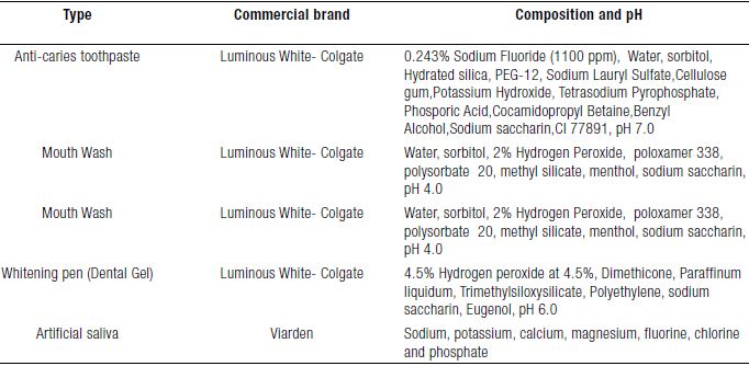 The today’s cosmetic treatments are requested more and more by most of the patients looking for different methods to help them look younger, consequently dentistry does not escape to this current trend. One of the most solicited dental treatments now a day is teeth whitening. However, in many occasions the high costs these treatments represent or even the diverse technical impossibilities, make it impossible for the specialist to apply it to certain patients. Because of these situations, some turn to methods that are easier, more economical, and readily available like dental hygiene products that have a whitening effect. The market has, primarily, toothpastes, mouthwashes and whitening pen that can be named “Do-it- yourself” products (DIY), which can contain different active ingredients such as carbamide peroxide, hydrogen peroxide (HP), or sodium bicarbonate.