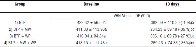 Table 2 shows us the mean and standard deviations of the Vickers hardness number (VHN) in the study groups in its baseline state and 10 days after the treatment. There was no statistically significant difference in the VHN in its baseline state among the experimental groups (Two-way analysis, p>0.05). It can be observed that in all of the study groups the VHN decreases after 10 days of treatment in comparison to its baseline state, with statistically significant difference (Two-way analysis, p<0.05). When comparing these values (before and after the treatment), significant statistical differences (student t test, p<0.05) were observed in all the groups except for group 1. Likewise, we observed that the lowest percentage (-10%) of the decrease in the micro-hardness of the enamel after the treatment was found in group 1 and the highest percentage (36%) was found in group 4. There was statistically significant difference in the VHN observed 10 days after treatment among the experimental groups (Two-way analysis, p>0.05). When comparing pairs of groups, significant statistical differences was founded in all the comparisons with exception of groups 2 vs 4 (student t test, p<0.05); the most evident difference was found in groups 1 vs 2 and 1 vs 4.
