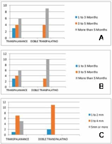 The maximum duration of canine retraction was 3-5 months in 8 patients (with both maintainers), >5 months in 15 patients (9 with double ATP and 6 with transpalanance), and 1-3 months in 3 patients (using transpalanance). This was because transpalanance has a stricter control, and therefore allows for better mechanical canine retraction (Figure 4A).