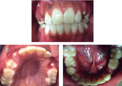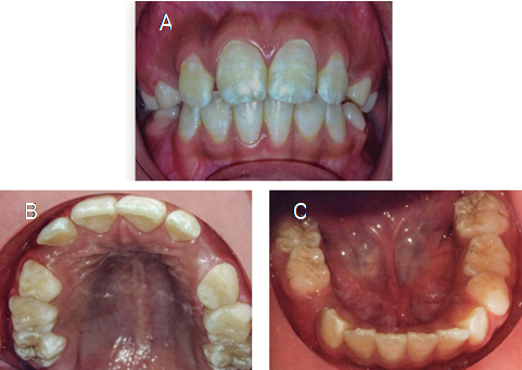 Intraoral examination. The patient´s oral cavity exhibited an almost completely erupted mixed dentition, good-shaped dental arches with a very mild incisor crowding, excessive plaque accumulation, and halitosis, indicating neglected oral health and hygiene procedures. The incisor labial faces exhibited white/yellow spots, likely due to enamel fluorosis (Figure 1). Shallow carious cavities were present in the first four permanent molars. The patient exhibited a mild fissured geographic tongue; however, gingiva, other soft tissues, and tonsils did not exhibit any abnormalities.