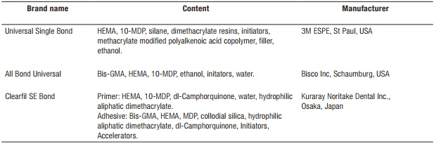 Universal Single Bond adhesive system: 3M Universal Single Bond (3M ESPE, St. Paul, MN, USA), was applied for 20s, gently dried using an air syringe for 5s, and polymerized in a polymerization device (Valo Ortho LED, Ultradent Products, Inc. South Jordan, USA) for 10s.