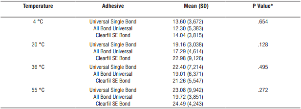 Universal dental adhesives were developed to reduce the sensitivity of clinical techniques and to simplify clinical steps. Their versatility allows them to be applied using either the etch-rinse or the self-etch technique. Perdigao et al. (9) reported that Universal adhesives had higher bond strength values on the dentin tissue than Clearfil SE Bond. Munoz et al. (10) reported higher bond strength values for the Clearfil SE Bond, the gold standard for self-etch adhesive systems in comparison to single bond Universal adhesives. Their results are comparable to the results of this study, which showed that Clearfil SE Bond adhesive had the highest SBS at all temperatures compared to the two Universal Bond adhesives. However, there was no statistical difference amongst the three adhesives. The differences in the SBS of the adhesives can attributed to the pH of the adhesives, which was 3, 2.7 and 2 for the All Bond Universal, Universal Single Bond, and Clearfil SE Bond, respectively. Adhesive systems, represented by their low pH, may have acted positively by demineralizing the dentin tissue and probably helping the tags to bond to the exposed collagen inside the tubules. In our study, MDP in the adhesive systems as it is known to ionically bond to Ca ions forming stable MDP-Ca salts in accordance with the adhesion decalcification concept (11). A comparison of the two Universal adhesive systems showed that the Universal Single Bond adhesive had a higher SBS in comparison to the All Bond Universal. The polyalkenoic acid copolymers in the single bond Universal adhesive system are different from those in other adhesive systems because the carboxyl groups in the polyalkenoic acid copolymer can bond with hydroxyapatite by replacing phosphate ions to form ionic bonds with calcium (12).
