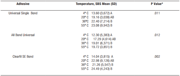 RESUMEN: El objetivo de este estudio fue evaluar la resistencia al cizallamiento (SBS) de dos adhesivos universales (Universal Single Bond y All Bond Universal) y un sistema de adhesivo de autograbado de dos pasos (Clearfil SE Bond) a la dentina en diferentes temperaturas. Materiales y métodos: Ciento veinte muestras de dentina se dividieron aleatoriamente en 12 grupos, de acuerdo con los sistemas adhesivos (Universal Single Bond y All Bond Universal, Clearfil SE Bond) y la temperatura (4ºC, 20ºC, 36ºC, 55ºC) utilizada. Se prepararon muestras de dentina (n: 10), se aplicaron los sistemas adhesivos y se polimerizaron los cilindros compuestos. El análisis estadístico de los datos de SBS se realizó utilizando el análisis de varianza de dos vías (ANOVA) y la prueba post-hoc de Tukey's. Resultados: El Clearfil SE Bond mostró tener un SBS más alto que los adhesivos universales en todas las temperaturas evaluadas; sin embargo, no hubo una diferencia estadísticamente significativa (P> 0.05). En todos los grupos, los valores más bajos de SBS se observaron en las muestras a 4°C, mientras que los valores de SBS más altos fueron obtenidos en las muestras a 55°C (P <0.05). Conclusiones: Los resultados sugieren que la efectividad de un adhesivo puede aumentar si se precalienta a 36°C o superior, antes de usarlo inmediatamente después de sacarlo del refrigerador o a temperatura ambiente.