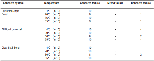 The results of the SBS test are presented in Table 2 and Table 3. The result showed that the Clearfil SE Bond specimens had the highest SBS of all the adhesives at all temperatures; however, the differences in the SBS of the adhesive systems were not statistically significant (P>0.05). The Universal Single Bond and All Bond Universal adhesive system groups had the lowest SBS values at 4°C and the highest SBS values at 55°C, and there was a statistically significant difference between the different temperatures (P<0.05). None of the specimens showed any fracture in the dentin and there was no statistical difference in the adhesive remnant indexes of all the groups. Adhesive failure modes are presented in Table 4.