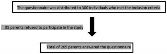 According to the power analysis, a total of 172 participants were found to be sufficient (power: 0.95, effect size: 0.3 and 5% standard error). Finally, 300 participants were included to the study to compensate possible dropouts. A flow diagram to describe the study process is presented in Figure 1. We conducted a pilot study with 20 parents to test the questionnaire which was modified from a questionnaire that was validated by Serra-Negra et al (13). The results of the pilot study demonstrated that there is no need to change the questionnaire and the participants of the pilot study were not included in the present study.