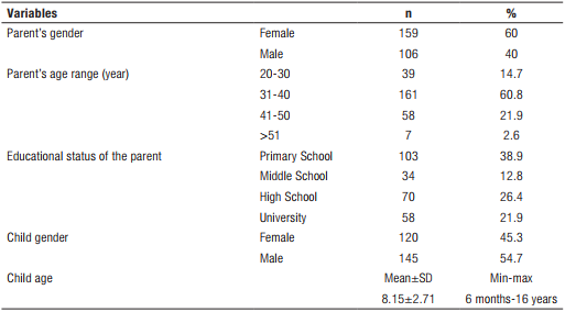 The questionnaire was distributed to 300 individuals who met the inclusion criteria and a total of 265 parents (159 were female and 106 were male) participated in the study and answered the questionnaire (88.33% participation rate). Most of those parents (60.8%) were between the ages of 31-40 and only 2.6% were over 51 years old. Information on educational backgrounds of the participants is shown in Table 1.