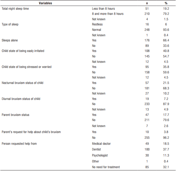The rate of clenching and grinding of teeth during sleep (21.5%) was higher than the rate when they were awake (7.2%). Interestingly, the ratio of the parents seekied treatment for their children because of this harmful habit was very low (3.8%). It was observed that in case of bruxism, 37.7% of the parents would seek help from the dentist, 18.5% from a medical doctor and 11.3% from a psychologist. However, 32.1% of the parents stated that there was no need for treatment for teeth clenching and grinding (Table 2).