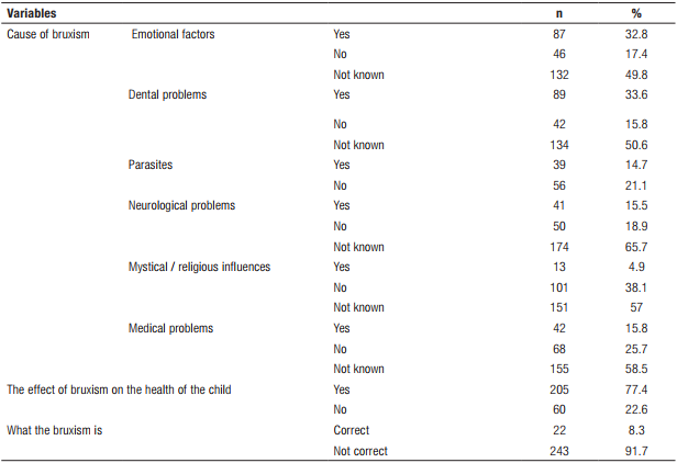 ABSTRACT: Objective: Bruxism is a jaw muscle activity disorder characterized by clenching or grinding of the teeth and can be seen in both children and adults. The purpose of this study is to evaluate the parental knowledge about bruxism in children. Methods: A cross-sectional study was conducted with 265 parents whose children were attended at University of Mersin pediatric dentistry and oral and maxillofacial surgery clinics. Children’s ages varied from 6 months to 16 years old. A 20-questioned questionnaire was used to collect the data. IBM SPSS Statistics 22 for statistical analysis (SPSS IBM, Turkey) program was used for the analysis. Results: A total of 265 parents (159 were female and 106 were male) participated in the study. The majority of the parents were between the ages of 31-40 (60.8%). The rate of clenching and grinding of teeth during sleep (21.5%) was higher than the rate when they were awake (7.2%). The ratio of the parents seeking treatment for their children because of this harmful habit was very low (3.8%). The majortiy of parents (37.7%) reported that they seek help from dentists. The participants believed that bruxism was associated with dental problems (33.6%) and emotional factors (32.8%). A significant difference was found between the educational background of the parents and the ability to define bruxism. Conclusion: Parents had inadequate knowledge about bruxism in children and this was mostly related to the educational background of the parents.