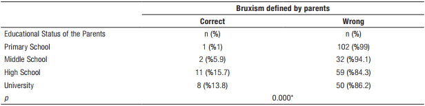 There was a statistically significant difference between the educational background of the parents and the ability to define bruxism (p<0.001). The paired comparisons showed that the ratio of parents who defined bruxism correctly was significantly lower among primary school graduates (1%) compared to high school (15.7%) and university (13.8%) graduates (Table 4).