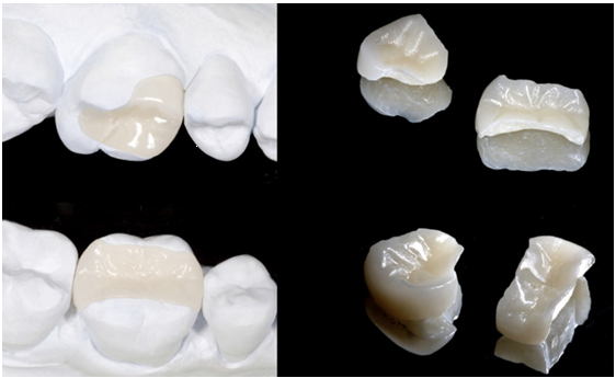En general, para la confección de coronas parciales de cerámica, se utilizan materiales cerámicos de vidrio reforzados con disilicato de litio translúcido, debido a que permiten un resultado final más natural. Varios estudios clínicos también han demostrado que las inlay u onlay adheridas con cementos resinosos de fotopolimerización tienen un desempeño clínico excelente a largo plazo (61,62,13,14,15).