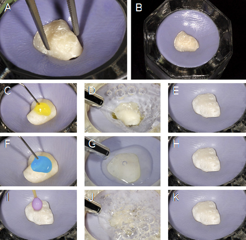Inicialmente se colocó la pieza protésica sumergida “embutiéndola” en una porción de material pesado de impresión sobre un Dappen, de forma tal que cubriera y protegiera el área externa de la corrosión del ácido fluorhídrico, esto porque el hacer correr ácido sobre el “Glasé” “brillo externo” de la corona parcial podrá provocar opacidad externa después del lavado. El “embutido” de la pieza protésica debe ser contínuo de forma cubridora, donde solo se pueda observar la superficie interna de la pieza protésica expuesta. Enseguida se procedió a la aplicación de ácido fluorhídrico HF- al 10% por un tiempo prudencial de 20s, el gel se aplicó sobre toda la superficie interior y la acción del ácido se incrementó frotándolo con un micropincel. El gel de ataque con ácido fluorhídrico HF- se enjuagó muy cuidadosamente con un spray pulverizado de aire/agua destilada durante 60s, secándose a continuación la superficie con aire. También fue aplicado posteriormente ácido fosfórico al 37% por 15s, lavando con spray pulverizado de aire/agua por 30s eliminando las sales minerales residuales y secando. Por último, se colocó Ivoclean (dispersión de partículas de óxido de metal en agua) por 20s (Ivoclar Vivadent; Schaan, Liechtenstein), lavando con agua/aire pulverizada nuevamente y secando copiosamente por 20s (Fig. 11A a 11K).