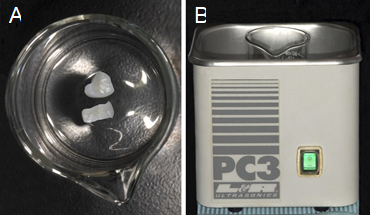 Posteriormente se retiró la pieza protésica “desembutiéndola” y se colocó en un beaker con agua destilada. El beaker fue introducido dentro del tanque de llenado del dispositivo ultrasónico, al igual con agua destilada, el dispositivo se accionó por 5 minutos aproximadamente. Después del tiempo determinado fue retirada del recipiente beaker la pieza protésica antes de apagar el dispositivo de ultrasónico. Inmediatamente se dejó reposar y se secó copiosamente hasta observar una superficie color “Blanco Tiza”. Este procedimiento de limpieza nos permitió eliminar totalmente las trazas residuales de sales minerales no removidas en su totalidad por el ácido fosfórico, provocando la limpieza de las microretenciones provocadas por el ácido fluorhídrico HF- 10% totalmente (Fig. 12A & 12B).