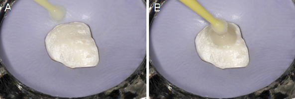 Después del lavado del acido fosfórico se debe verificar muy bien de forma visual la no presencia de trazas o residuos de ácido fosfórico, esto porque al no ser removidas totalmente interfiere en la polimerización completa del adhesivo y del cemento resinoso utilizado, provocando fallas adhesivas colaterales con desprendimiento de la restauración protésica (Fig. 15A & 15B).