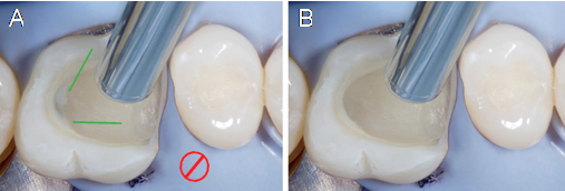 Los ángulos internos confeccionados por el área inicial activa de la punta diamantada permitieron obtener ángulos redondeados, los cuales, minimizaran considerablemente las concentraciones de estrés de fuerzas axiales provocadas por la masticación, o movimientos de lateralidad, protusivos y retrusivos, que podrían comprometer la fractura del remanente dental o en la mayoría de los casos la restauración. A su vez, los márgenes proporcionados en la confección de la cavidad por la extensión de la punta diamantada, fueron bien delimitados por ángulos cavosuperficiales nítidos conformados por angulaciones de 90º, estos formados por las paredes internas expulsivas de la cavidad y la superficie externa del remanente dental, en la mayoría de los casos constituida por esmalte. Siendo, el esmalte a su vez un elemento de suma importancia en el momento de la aplicación del sistema adhesivo para un mejor y mayor selle marginal provocando la vedación del esmalte en el momento de la etapa de cementación, garantizándonos así permanentemente una mejor calidad del selle marginal de la restauración. Estas características nos permitirán obtener una adaptación delimitada casi perfecta por la restauración parcial de cerámica tipo Onlay.