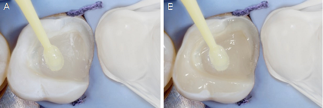 Antes de la polimerización del cemento, el hilo dental se colocó interproximalmente para eliminar el exceso de cemento resinoso en las áreas de mas difícil acceso, al realizar este procedimiento es importante estabilizar la restauración protésica con el dedo, para que no ocurra desplazamiento o dislocación de la misma. El hilo dental se desplazó desde el área lingual hacia el área vestibular llevándolo suavemente a una velocidad uniforme y constante. Esto debe repetirse hasta que todo el exceso de material de cemento resinoso se eliminen interproximalmente. Es importante dejar una cantidad de cemento resinoso en las superficies de más fácil acceso, como vestibular y palatino/ lingual pero nunca en el área interproximal, esto nos permitió controlar la polimerización química en proceso por medio de su endurecimiento. Así después de este procedimiento la corona parcial se estabilizó con un instrumento liso y redondeado una vez más (Fig.17 A & 17B). Cada superficie se fotopolimerizó durante 20s con una intensidad de luz de 1200 mW/cm² en vestibular, palatino/lingual, mesio-oclusal y disto-oclusal, así completando el primer ciclo y el más importante de todos como protocolo, la punta de la unidad de fotopolimerización debe colocarse lo más cerca posible de la superficie de la restauración.