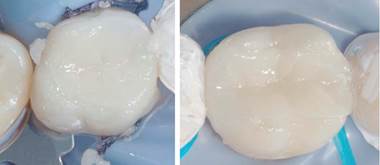 Para el procedimiento de cementación de la restauración parcial de cerámica, inicialmente se aplicó una capa ultrafina de heliobond (Ivoclar Vivadent; Schaan, Liechtenstein) sobre la superficie interna silanizada de la pieza protésica, soplando muy suavemente y provocando mayor adelgazamiento de la película por un tiempo de aproximadamente 5s. Después la pieza protésica se dejó reposar lejos de la luz natural o luz operatoria cubriéndola con una pantalla ultravioleta contra luz natural para evitar la polimerización prematura del adhesivo. La corona parcial cerámica posteriormente, fue cargada en todas las superficies con cemento resinoso Multilink N (Ivoclar Vivadent; Schaan, Liechtenstein) y se colocó suavemente sobre la superficie del diente preparado, haciéndola coincidir con la preparación cavitaria confeccionada. Así, se buscó nuevamente la vía de inserción correcta y se inició parcialmente la adaptación de la restauración. Posteriormente se aplicó presión uniforme sobre la superficie oclusal, procediendo de suave a fuerte, este procedimiento de presionar y presionar se repitió de 2 a 3 veces, así la corona parcial llegó a estabilizarse completamente con el dedo, para posteriormente acercar un instrumento de bolita hacia el centro de la pieza protésica para estabilizarla. Existe una etapa de pre-gelificación donde el cemento fluye en consistencia con apariencia brillosa en su superficie. El exceso del cemento resinoso se eliminó cuando su polimerizacion química (endurecimiento) fue evidente con la perdida de brillo en todos los márgenes periféricos, con un explorador de punta fina. Los márgenes se verificaron una vez más con el explorador y se eliminó el último exceso de cemento resinoso. Si los márgenes desaparecen (tactilmente con el explorador no se siente un degrade), la corona parcial se encuentra bien adaptada y totalmente ajustada, como ocurrió con nuestras dos restauraciones parciales en cerámica de las piezas dentales en 1.6 y 4.6.