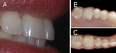 Paciente de 25 años, sexo femenino se presentó a la clínica dental para realizar una revisión dental de rutina. Con el examen clínico y radiográfico se determinó que su condición dental era buena, con estado periodontal estable y técnicas personales de higiene bucal diariamente bien aplicadas (Fig.1). Su queja principal, “tengo dos restauraciones feas en resina que las veo de diferente color y más cuando me sonrío” (Fig. 2A a 2C).