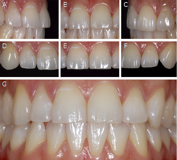 Las condiciones ideales sobre higiene oral y periodontal serán indispensables al inicio, durante y después de todo tratamiento dental restaurador. El compromiso del paciente al aceptar el tratamiento y permitir promover su estado de salud bucodental, facilitaran las condiciones para que el pronóstico sea aun más exitoso. Valorar periódicamente, crear conciencia, incentivar e impartir técnicas de higiene oral y cepillado dental ofrecerán como resultado final la garantía de un excelente desempeño clínico. De esta forma, inicialmente el paciente fue sometido a terapias de profilaxis y promoción de la salud bucodental durante 15 días antes del tratamiento, obteniéndose resultados finales satisfactorios para iniciar con su plan del tratamiento restaurador (Fig. 3A a 3G).