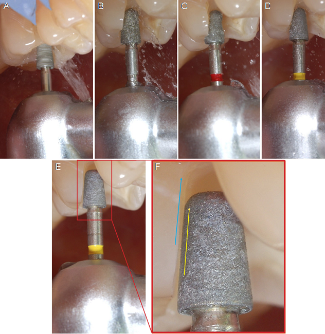 Las puntas diamantadas fueron seleccionadas con las series #3131(G,F,FF), #4137(G,F,FF), #4138(G,F,FF), (KG Sorensen, Cotia, SP, Brasil), teniendo la particularidad de proporcionarnos las características necesarias para este tipo de preparaciones, confeccionando así, paredes ligeramente expulsivas con angulaciones en toda su extensión en forma continua de aproximadamente entre 6º a 10º grados, permitiéndonos aumentar y asegurar la estabilidad mecánica e inserción en forma pasiva de las restauraciones parciales de cerámica tipo Onlay que serían confeccionadas extraoralmente en el laboratorio (Fig. 5A a 5F).