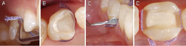 Para la colocación de los hilos retractores fue utilizado un instrumento empacador de hilo retractor dentado, insertando el hilo # 000 o similar dentro del surco, iniciando en las superficies vestibulares, y siguiendo el protocolo de sumergirlo sin dilacerar la encía llegando al fondo del surco con movimientos suaves de “carreta” para permitir introducirlo poco a poco hasta llegar a la superficie contraria, en este caso, las superficies finales palatina y lingual de cada una de las piezas dentales (Fig. 7A a 7D).
