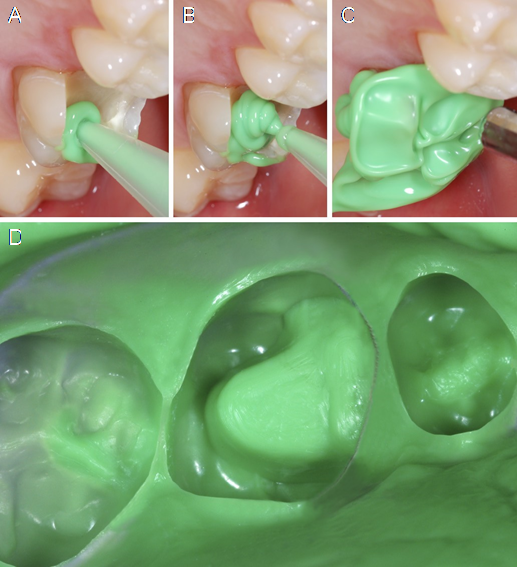 Las impresiones fueron realizadas con material de impresión polivinilsiloxano, silicona por adición, con la técnica monofásica, sin retirar los hilos retractores y con una cubeta total acorde a las arcadas superior e inferior. La técnica utilizada para la aplicación del material de impresión en la cavidad oral, permite colocar el material fluido y a la vez esparcirlo sobre la preparación cavitaria con un soplo de aire suave mientras se va aplicando, para luego recibir la cubeta cargada con los dos materiales, pesado y liviano aun no endurecidos. El resultado, una impresión nítida con terminaciones bien definidas en toda la extensión de la preparación cavitaria (Fig. 8A a 8D).