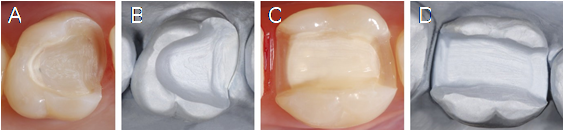 Una vez terminadas las preparaciones se revisaron cada uno de los requisitos y detalles finalizados en la geometría cavitaria (Fig.6A a 6D). Las características principales de este diseño modificado de preparación cavitaria son más frecuentemente utilizados para coronas parciales de cerámica, creando una superficie lisa de dentina con transiciones graduales y suaves entre concavidades y convexidades. No se requiere ninguna forma de resistencia y retención en ella y el perfil de la preparación sigue una curva suave y continua, con ángulos redondeados para aumentar y asegurar la estabilidad mecánica de la restauración. Además, el diseño no retentivo de la preparación del diente se considera como parte de un concepto completo, lo cual resultará en una carga biomecánica más favorable para el complejo formado por restauración - cemento adhesivo - diente, minimizando cualquier tipo de fuerza aplicada en su funcionalidad. Existen cuatro requisitos del diseño en la preparación cavitaria del diente. Inicialmente el área de la preparación debe ser resistente, debido a que durante la oclusión y masticación, las fuerzas oclusales de trabajo y de balance se concentran principalmente en el área central profunda del diente, sobre el piso pulpar, donde la superficie es capaz de soportar y apoyar mas continuamente la restauración. Las superficies preparadas deben ser lisas sin transiciones bruscas para disminuir la concentración de la fuerza tensil en el complejo compuesto por el diente, el cemento y la restauración. En el sistema adhesivo que es un material compuesto fluido, se crea un área de disipación de la fuerza tensil. Esto significa que las fuerzas absorbidas por la restauración se transfieren de la manera más favorable a la interface adhesiva y al diente, convirtiendo la fuerza de tracción aplicada en la cerámica y la interface adhesiva, en fuerza compresiva. Un cuarto requisito es que los márgenes de la preparación deben ser definidos con precisión para que la preparación permita el mejor ajuste posible interno y marginal de la restauración, así la línea de cementación debe variar entre 50 y 100μm (38,39).