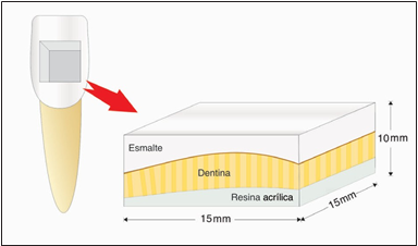 Fueron seleccionados 36 incisivos bovinos almacenados en Timol (0,2%, pH7), donde estuvieron completamente sumergidos, luego ellos fueron cortados en forma rectangular, usando un disco diamantado de baja velocidad (mdc dental). Después, fueron sumergidos en un bloque de resina acrílica15x15x10mm. Cada superficie vestibular del esmalte fue pulida en húmedo con papel de lija de carburo de silicio de 400, 600, 1200. Las muestras fueron almacenadas previamente por siete días en agua desionizada a 37°C. (Fig. 1) Las muestras se dividieron en tres grupos de 12 muestras cada uno, según los geles blanqueadores a ser aplicados.