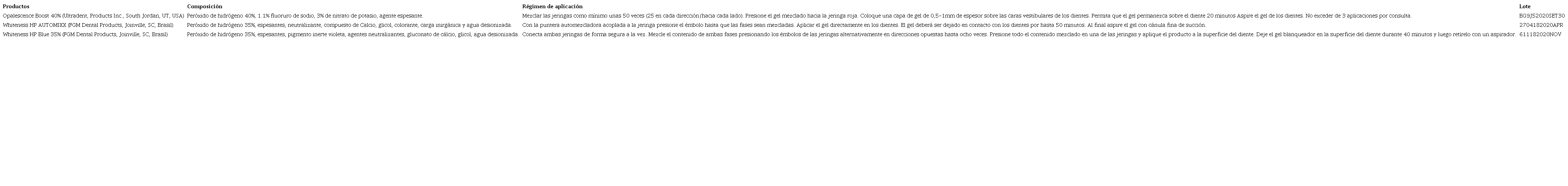 Los grupos de estudio fueron divididos de acuerdo a los geles blanqueadores que se aplicó, Grupo 1: gel de peróxido de hidrógeno al 40% (Opalescence Boost), Grupo 2: peróxido de hidrógeno al 35% (Whiteness HP AUTOMIXX) y Grupo 3: peróxido de hidrógeno al 35% (Whiteness HP Blue) (Tabla 1).