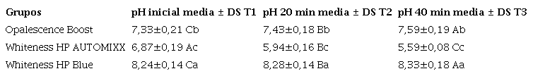 Hubo una tendencia al aumento del pH en el grupo de peróxido de Hidrógeno 40% (Opalescence Boost 40%) y Peróxido de hidrógeno 35% (Whiteness HP Blue), excepto el grupo peróxido de hidrógeno 35% (Whiteness HP AutoMixx), luego de 40 minutos de aplicación.