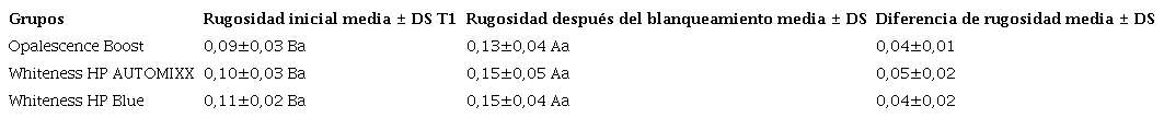 Los datos de rugosidad superficial (promedio y DS) del esmalte bovino antes y después del blanqueamiento son presentados en la Tabla 3. La Prueba Friedman demostró diferencia estadísticamente significativa en valor de la rugosidad superficial entre los grupos antes y después del blanqueamiento (p<0,05).