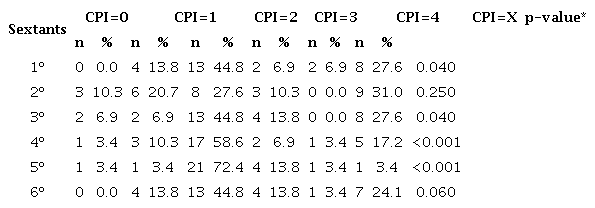 In the first sextant, the significant majority of individuals were in the gingivitis stage 58.6% (p=0.040), others (13.8%) in the periodontitis stage, and 27.6% had the excluded sextant. There was edentulism (CPI=X) in all sextants, especially in the 1st (27.6%), 2nd (31%) and 3rd (27.6%) sextants (Table 1).