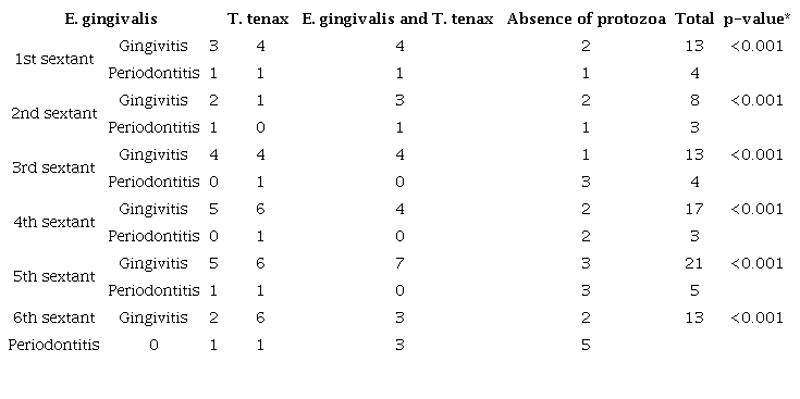Most individuals are in the gingivitis stage, especially when considering 1st, 3rd, 4th and 5th sextants. The occurrence of E. gingivalis and / or T. Tenax microorganisms was observed in 77.06% of patients with periodontal disease, in addition to the association of these two protozoans in the condition of gingivitis and periodontitis in all sextants (p <0.001) (Table 2).