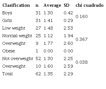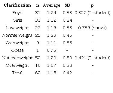 In addition to the above, there was no statistically significant difference (p=0.639) between the average of teeth with gingival bleeding in boys which was 1 and girls, 0.94. When relating number of teeth with BOP and body mass index, children without excess weight, had more teeth with gingival bleeding (0.97) than those in the overweight group (0.94).