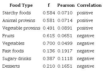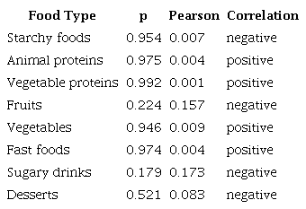 Using Pearson's correlation, it was observed that there was a positive correlation between the consumption of vegetable proteins, animal proteins, vegetables, and fast foods with increased BOP, however, these results were not statistically significant (Table 5).